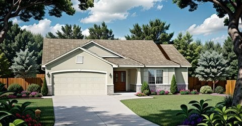 This charming Ranch-style house plan spans 995 square feet, making efficient use of its compact footprint. The exterior showcases a welcoming front with tasteful masonry accents, enhancing its curb appeal. The 44-foot width and 42-foot depth provide a balanced and symmetrical look. A covered porch at the entrance invites you to enjoy the outdoor ambiance, offering a delightful space for relaxation or greeting guests.