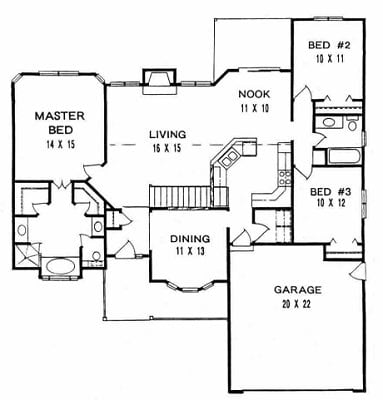 - Plan #1388 3 bedroom Ranch w/ Master Suite and stair landing exit — 1388 sq ft