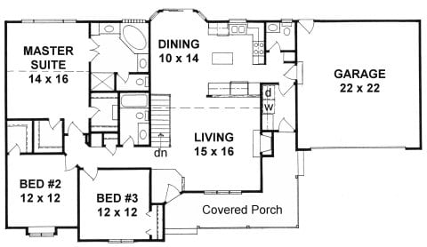 - Plan #1388 3 bedroom Ranch w/ Master Suite and stair landing exit — 1388 sq ft