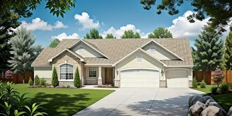 - Plan #14273 bedroom Ranch w/ partially enclosed deck and 3-Car Garage — 1427 sq ft